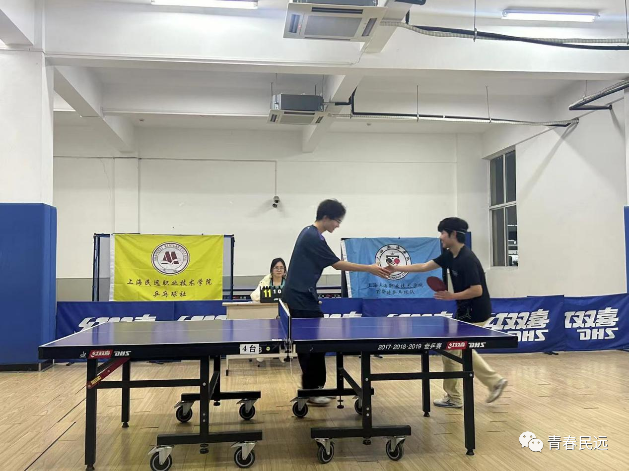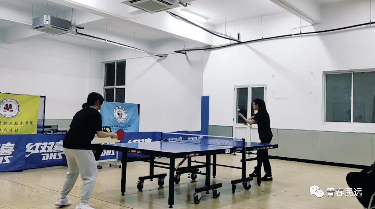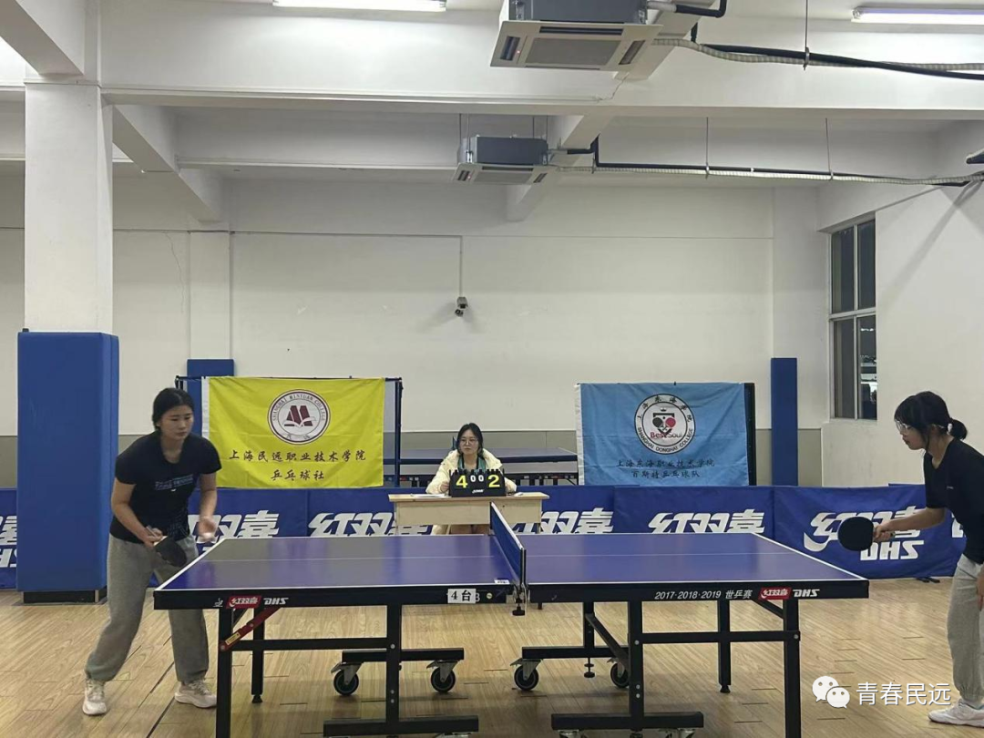 12 ⽉ 6 ⽇下午,上海⺠远职业技术学院乒乓球社代表队与上海东海职业技术学院百斯特代表队在上海东海职业技术学院乒乓球训练场,举⾏乒乓球团体友谊赛。⽐赛采⽤五局三胜淘汰赛制,单打、双打交替上演,甚是精彩。