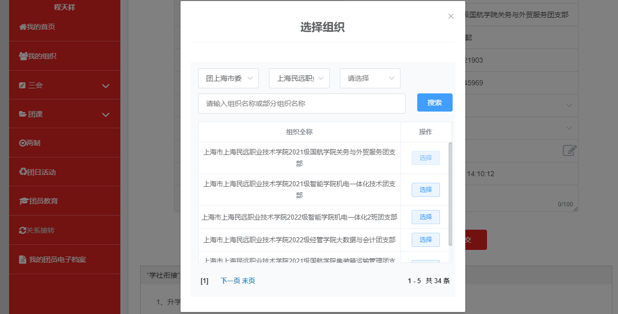(3)申请转入组织:依次选择团上海市委—上海民远职业技术学院团委,然后在下方列表选择:自己所在班级的团支部。